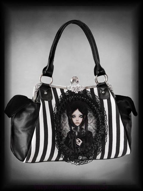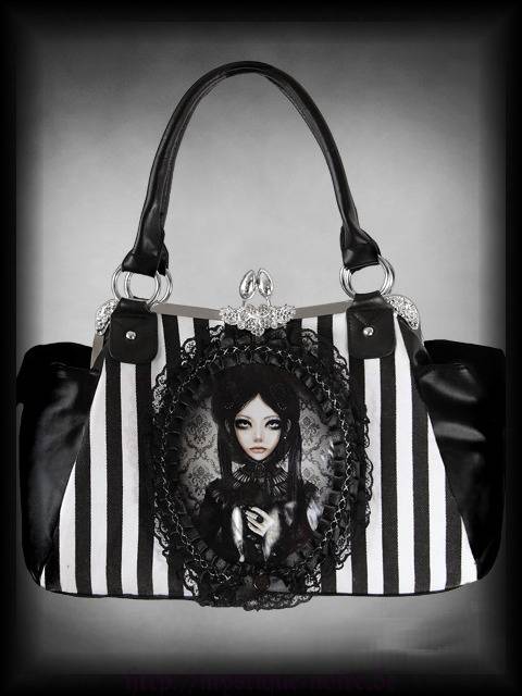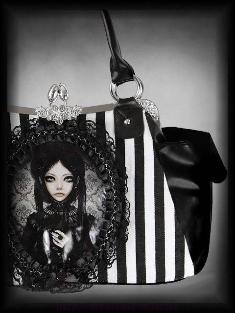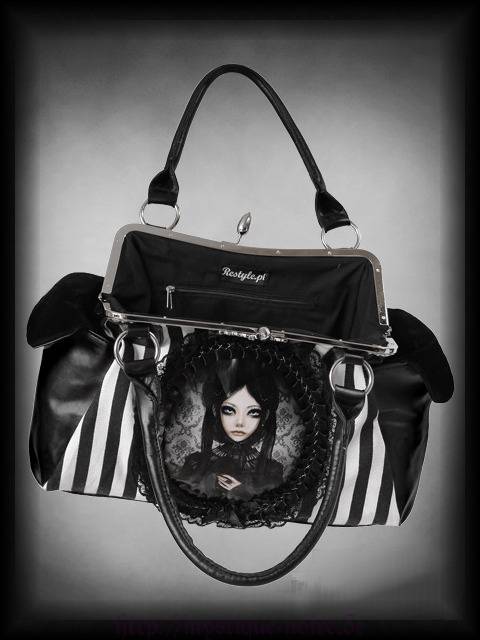 Handbag made ​​of thick black velvet and faux-leather (poliuretan). In the middle is a gothic doll digital print, surrounded with a faux leather frame. The Metal frame has a beautiful floral motif. On both sides of the bag are two roomy pockets made ​​of faux-leather. They're closing with magnet buttons. The lining inside has a zipped pocket.