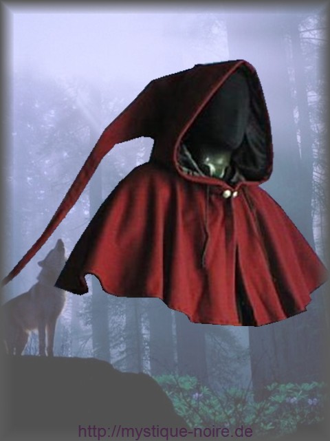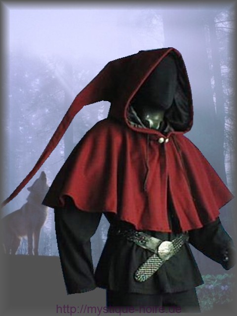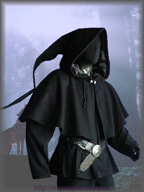 Woolen Gugel with lining and a long pointed hood. It will be closed with an ornamental button and a drawstring.