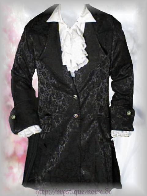 Long, black frock coat with two pockets - made of noble brocade The frock coat will be closed with ornamental buttons. The cuffs are decorated with buttons too. The frock coat is lined with satin ans at the back a bit shorter than at the front